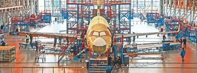 3月6日,工人在中國商飛上海飛機制造有限公司的生產車間內作業。