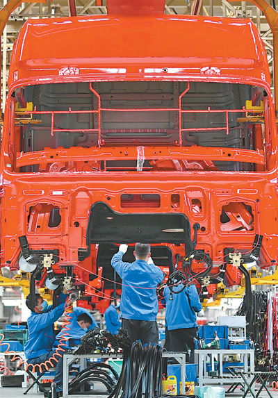 4月23日,工人在陜西汽車控股集團有限公司重卡總裝線工作。