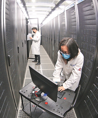 3月24日,中國移動(襄陽)數據中心,網絡工程師在新型綠色倉儲式數據中心進行網絡調試。