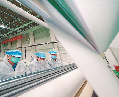 4月23日,燕山石化工人正在熔噴無紡布生產線上工作,該生產線僅用時12天就建成投產。