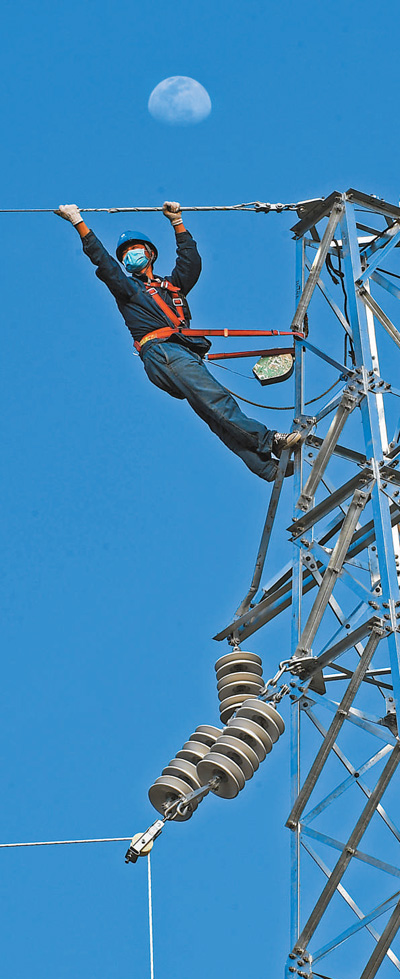 4月4日,在安徽省亳州市譙城區,國網亳州供電公司電力工人正在架設輸電線路。