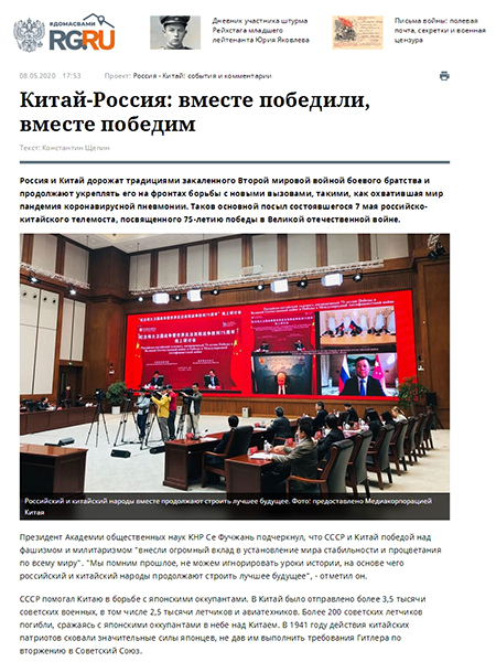 5月7日,“紀念偉大衛國戰爭暨世界反法西斯戰爭勝利75周年”線上研討會在北京和莫斯科同時舉行。與會專家學者表示,中俄歷來珍視兩國在世界反法西斯戰爭中結下的戰斗友誼,并將在應對新冠疫情等全球挑戰中不斷增強這一傳統,密切雙邊合作。