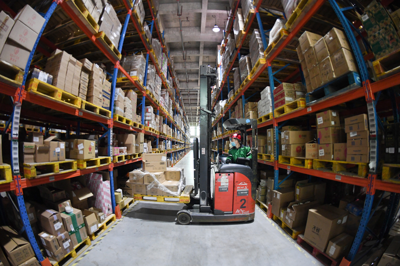 △在北京市順義區菜鳥物流倉庫,一名工作人員在擺放貨物。一季度,網上會議、線上交易、在線教育等促進信息傳輸、軟件和信息技術服務業增加值同比增長13.2%;實物商品網上零售額同比增長5.9%。