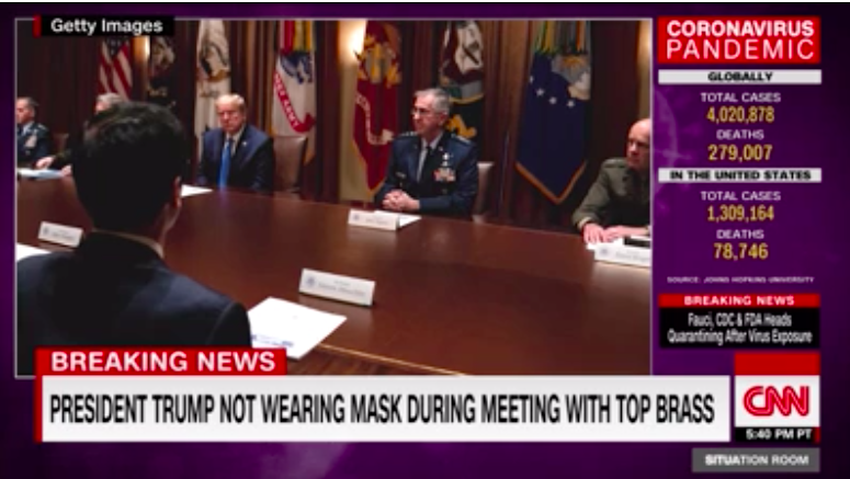 4月底,副總統(tǒng)彭斯參觀梅奧診所時(shí),成為了全場(chǎng)唯一不戴口罩的人。本周,特朗普參觀霍尼韋爾口罩工廠時(shí),戴上了護(hù)目鏡,卻沒(méi)有戴口罩。