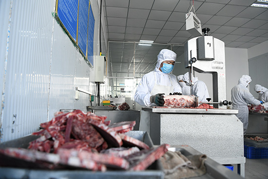 扎魯特旗瑪拉沁艾力食品有限公司工人正在切割牛排(陳立庚 攝)
