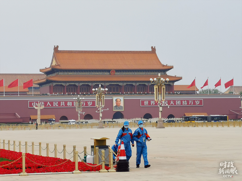 △政協委員抵達前,工作人員對天安門廣場做最后的檢查和清理。(總臺央視記者李曉周拍攝)