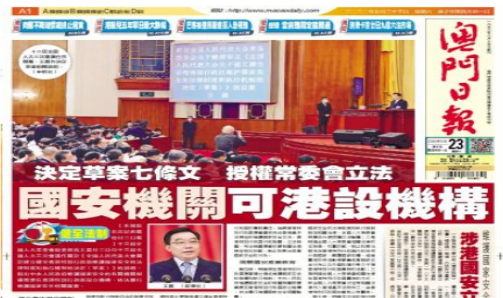 △《澳門日?qǐng)?bào)》頭版頭條大篇幅報(bào)道涉港國(guó)家安全立法