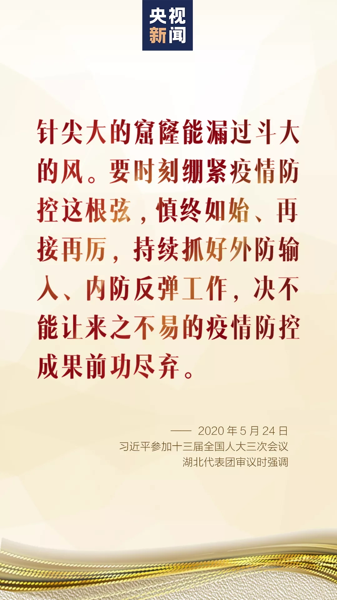 針尖大的窟窿能漏過斗大的風。要時刻繃緊疫情防控這根弦,慎終如始、再接再厲,持續抓好外防輸入、內防反彈工作,決不能讓來之不易的疫情防控成果前功盡棄。