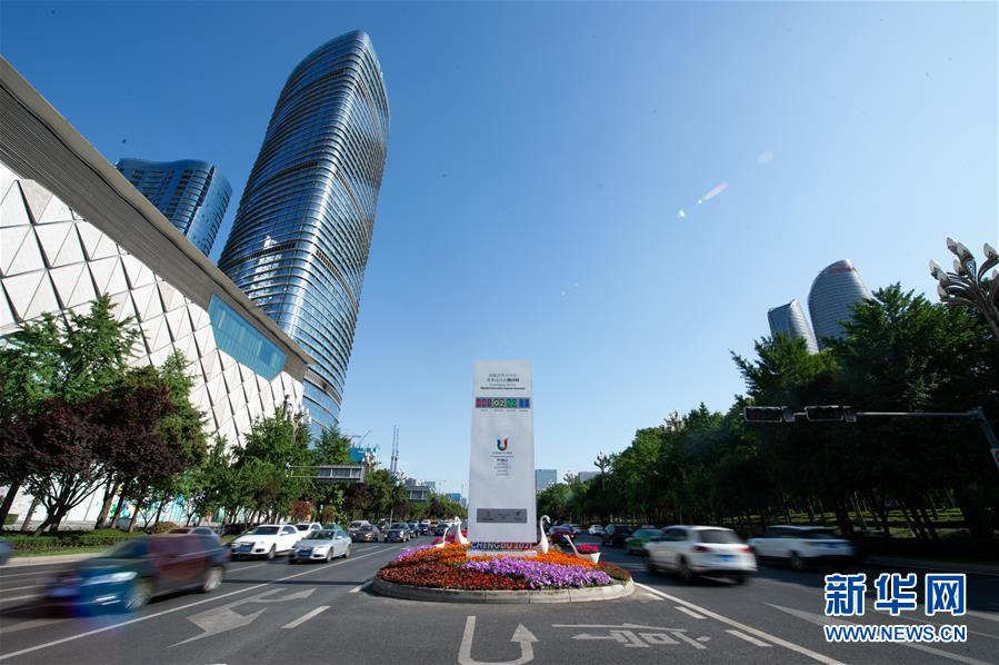 圖為6月3日拍攝的位于成都天府大道的大運(yùn)會(huì)倒計(jì)時(shí)裝置。 新華社發(fā)(胥冰潔 攝)