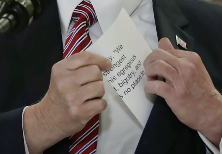 其實當時白宮幕僚已經寫好了講稿,照著念即可。媒體不小心拍到了部分講稿上不完整的詞句“最強烈地”“極為嚴重的”“偏執”和“在美國沒有市場”,明顯在批評白人至上主義。可當總統特朗普收起講稿的時候,幕僚們都明白,他們又要面對媒體的狂風暴雨了。