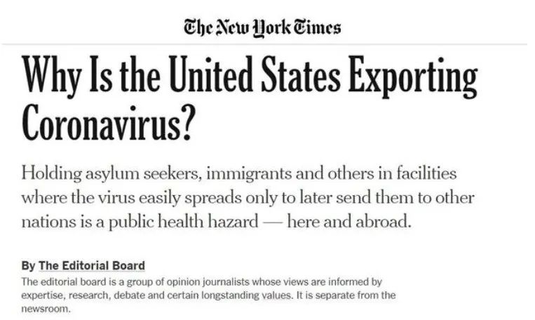 美國嚴重的疫情也給拉美國家?guī)黹g接危害。《紐約時報》日前刊載題為《美國為何在輸出新冠病毒》的評論文章稱,作為新冠肺炎疫情最嚴重的國家,美國大規(guī)模驅(qū)逐尋求庇護者的行為是在將病毒傳播到美國以外,尤其是拉美國家。文章指出,美國目前是世界上感染新冠病毒人數(shù)最多的國家,而且正把成千上萬可能已經(jīng)感染病毒的人驅(qū)逐到?jīng)]有能力應對這一病毒的貧窮國家,這一行為無異于輸出病毒。
