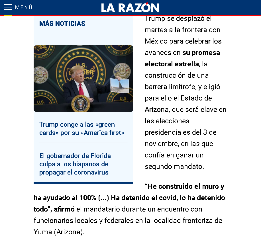 所以特朗普堅持認為真正的疫情是在墨西哥這一側的,正是他造的邊境墻擋住了疫情入侵美國。如果沒有邊境墻,包括加利福尼亞州在內的許多邊境州都會淪陷。也正是基于這一套理論,特朗普認為,就是因為這些來自邊境另一側的病毒入侵,所以像亞利桑那州這樣的邊境州才會成為全美的疫情重災區。