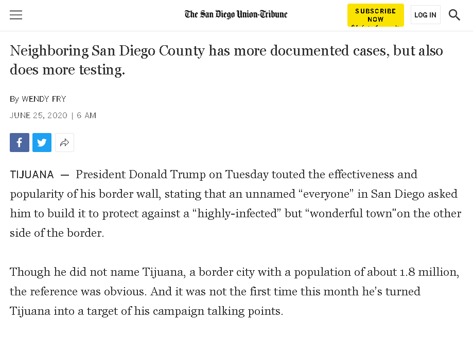 時間進入到6月下旬,雖然上述的措施都已經投入實施,不過美國國內的疫情數字仍在不停上漲,疫情的拐點還遙遙無期,在這樣的情況下,特朗普就只好繼續把疫情的鍋甩給墨西哥,把墨西哥與美國邊境線上最知名的口岸城市蒂華納塑造成病毒的集中區域,并且稱蒂華納已經成為“全球范圍內病毒的傳播源”。