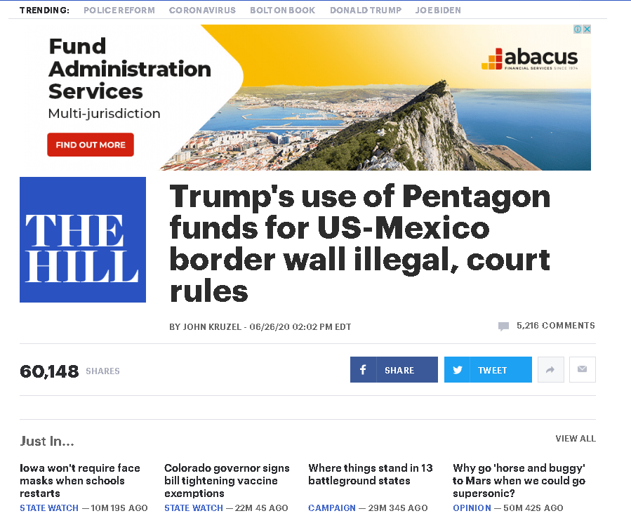 然而根據報道,就在美墨邊境墻剛竣工200英里的慶祝儀式剛剛過去3天,特朗普大贊其阻擋新冠病毒、加固邊境安全的熱度還維持高位的時候,在6月26日,美國加州一家聯邦法院就裁定,特朗普政府挪用五角大樓資金修建美國與墨西哥間的邊境墻屬于違法行為。