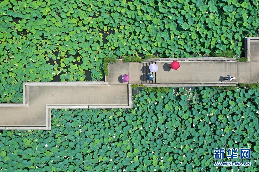 6月27日,游客在湖南省衡陽市石鼓區西湖公園一處棧道上賞花游玩(無人機照片)。 據文化和旅游部公布的端午小長假旅游統計數據,6月25至27日,全國累計接待國內游客4880.9萬人次,累計實現國內旅游收入122.8億元。 新華社發(羅盟 攝)