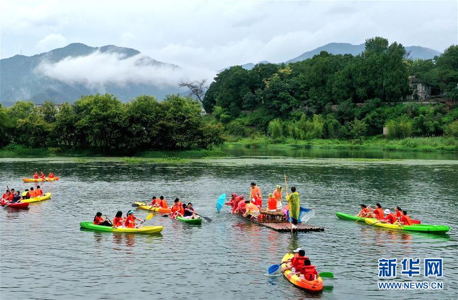 6月27日,在浙江省臺州市仙居縣橫溪鎮,游客在永安溪上體驗皮劃艇(無人機照片)。 據文化和旅游部公布的端午小長假旅游統計數據,6月25至27日,全國累計接待國內游客4880.9萬人次,累計實現國內旅游收入122.8億元。 新華社發(王華斌 攝)