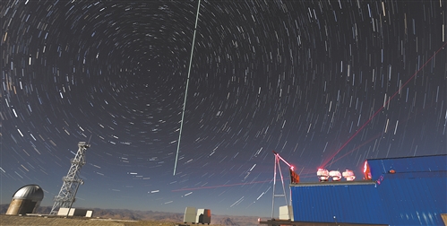 在西藏阿里觀測(cè)站,“墨子號(hào)”量子科學(xué)實(shí)驗(yàn)衛(wèi)星過(guò)境,科研人員在做實(shí)驗(yàn)(合成照片)。 新華社記者 金立旺攝
