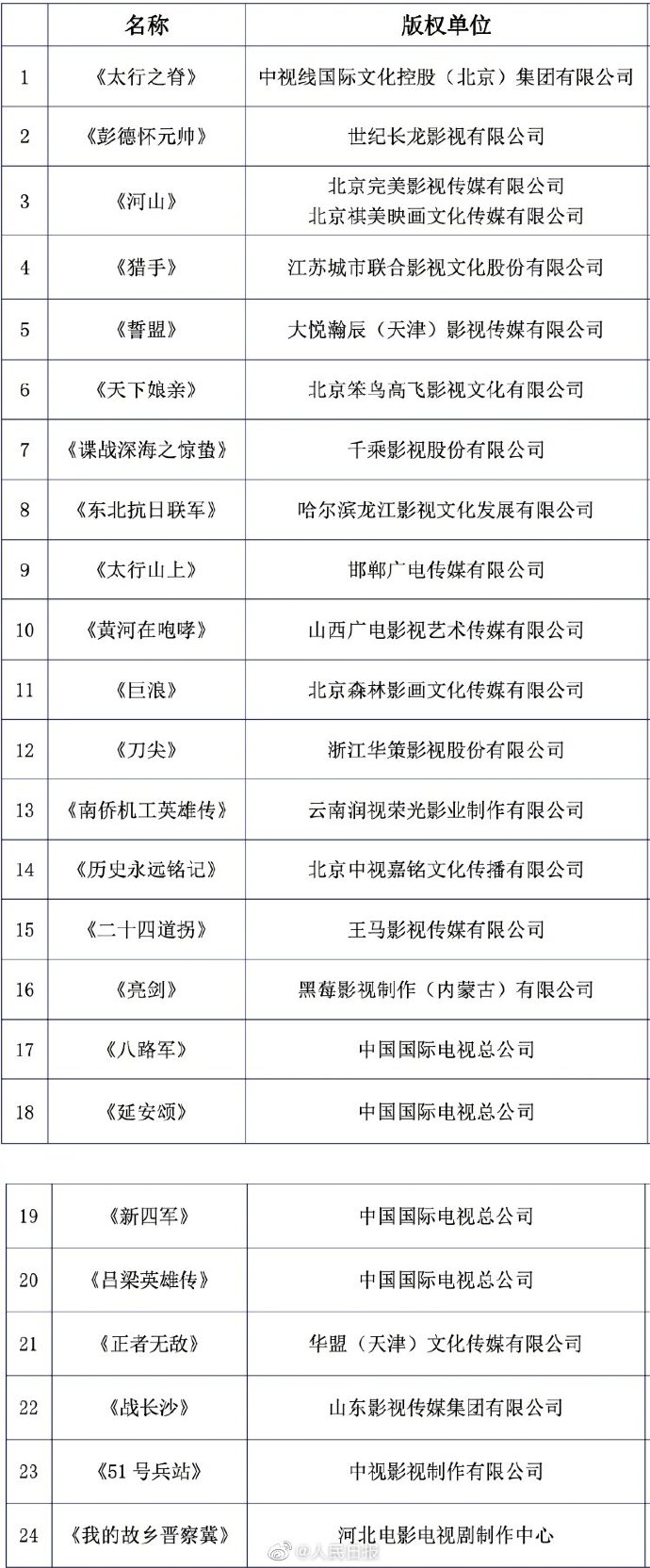 7月16日,國家廣播電視總局下發(fā)通知,即日起各級電視播出機構(gòu)要精心遴選播出抗戰(zhàn)題材優(yōu)秀電視劇。廣電總局從新創(chuàng)作和已播出抗戰(zhàn)題材電視劇中精選出部分劇目,作為各級電視臺播出參考,其中包括《彭德懷元帥》《河山》《亮劍》《諜戰(zhàn)深海之驚蟄》《南僑機工英雄傳》《戰(zhàn)長沙》等24部劇目。