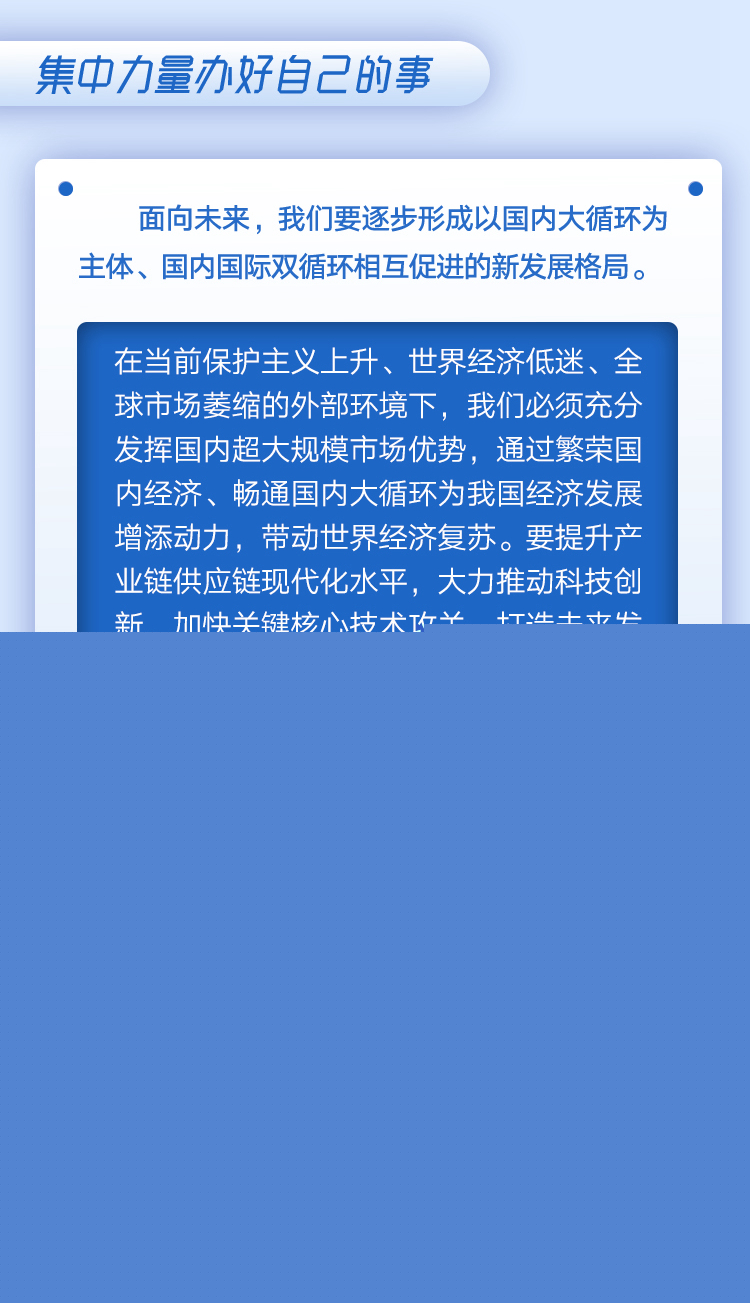 在21日召開的企業(yè)家座談會上,習(xí)近平強調(diào),集中力量辦好自己的事,形成以國內(nèi)大循環(huán)為主體、國內(nèi)國際雙循環(huán)相互促進的新發(fā)展格局。習(xí)近平指出,要通過發(fā)揮內(nèi)需潛力,使國內(nèi)市場和國際市場更好聯(lián)通,更好利用國際國內(nèi)兩個市場、兩種資源,實現(xiàn)更加強勁可持續(xù)的發(fā)展。