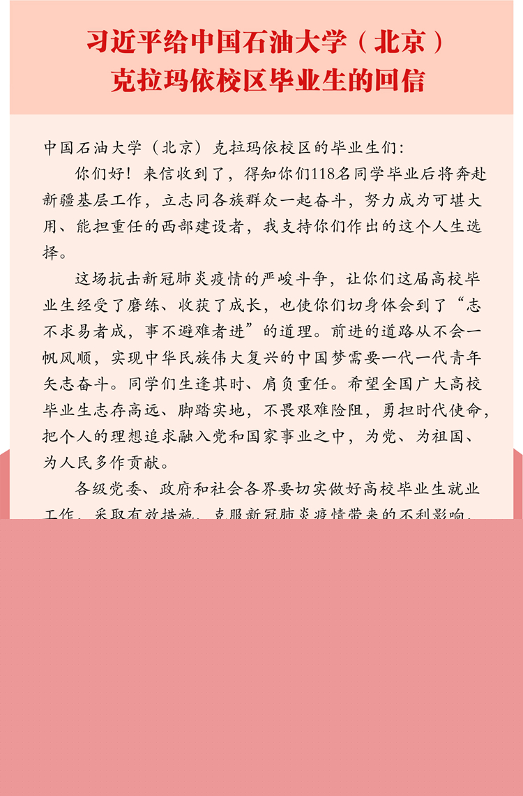 7月7日,在給中國石油大學(xué)(北京)克拉瑪依校區(qū)畢業(yè)生的回信中,習(xí)近平強調(diào),各級黨委、政府和社會各界要切實做好高校畢業(yè)生就業(yè)工作,采取有效措施,千方百計幫助高校畢業(yè)生就業(yè)。