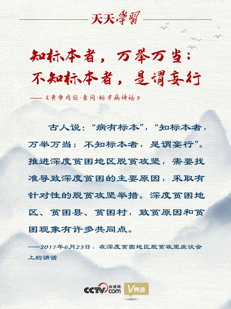 2017年6月23日,習(xí)近平總書記主持召開深度貧困地區(qū)脫貧攻堅座談會并發(fā)表重要講話。他在講話中引用古語“病有標本”“知標本者,萬舉萬當;不知標本者,是謂妄行”,指出深度貧困地區(qū)、貧困縣、貧困村,致貧原因和貧困現(xiàn)象有許多共同點。推進深度貧困地區(qū)脫貧攻堅,需要找準導(dǎo)致深度貧困的主要原因,采取有針對性的脫貧攻堅舉措。