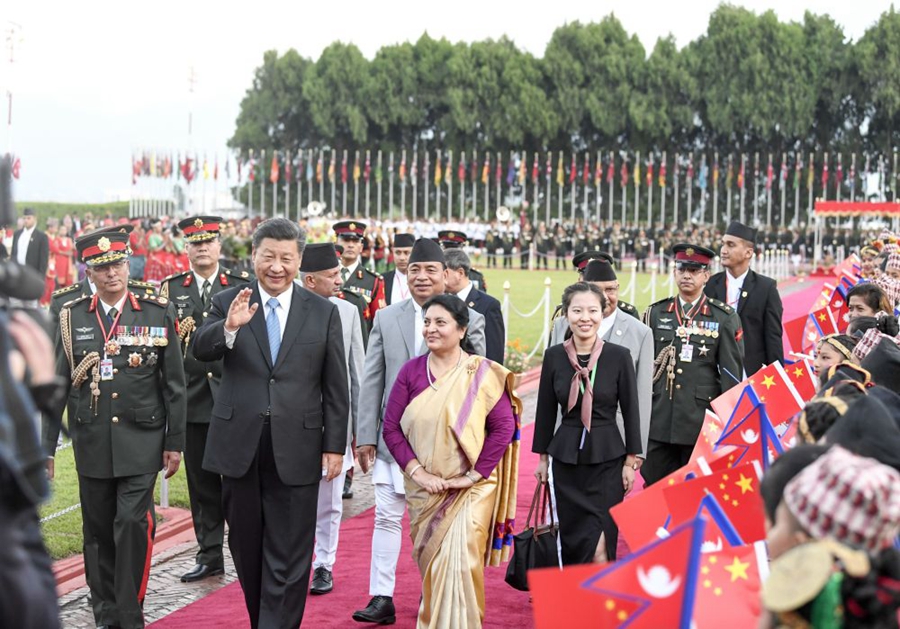 2019年10月12日,國家主席習近平乘專機抵達加德滿都,開始對尼泊爾進行國事訪問。尼泊爾總統班達里在機場為習近平舉行具有濃郁尼泊爾民族特色的歡迎儀式。新華社記者 高潔 攝