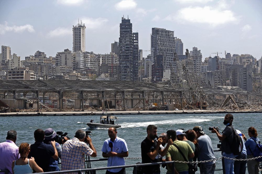 2020年8月8日,媒體記者在被炸毀的黎巴嫩貝魯特港口區采訪。貝魯特港口區4日傍晚發生劇烈爆炸,迄今爆炸已造成158人死亡、6000多人受傷,另有數十人下落不明。爆炸還造成約30萬民眾無家可歸。 新華社發(比拉爾·賈維希 攝)