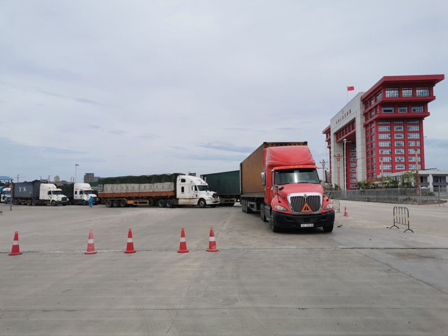 2020年6月8日,在廣西東興口岸,一批越南貨車在排隊候檢,準備通關。 新華社發(林珉正 攝)