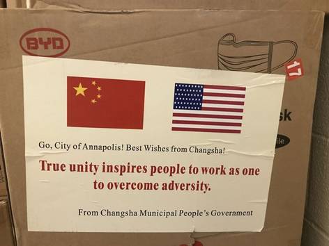據(jù)《首都公報(bào)》報(bào)道,一些口罩于8月份抵達(dá)安納波利斯市,其中一個(gè)包裝箱上印有中國(guó)和美國(guó)國(guó)旗,上面寫著:“加油,安納波利斯!來(lái)自長(zhǎng)沙的祝福!真正的團(tuán)結(jié)鼓舞人們齊心協(xié)力克服困難。”