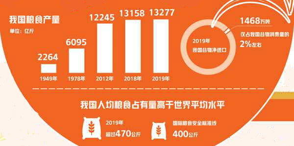 程國強:解決好吃飯問題,是中國人千百年來夢寐以求的目標。新中國成立后特別是改革開放以來,在中國共產黨的領導下,我國經過艱苦奮斗和不懈努力,在農業基礎十分薄弱、資源條件極其有限的基礎上,依靠自身力量,實現了由“吃不飽”向“吃得飽”,進而追求“吃得好”的歷史性轉變。這既是世界糧食安全的巨大成就,也是全球農業的歷史奇跡。統計數據顯示,1949年,我國糧食產量只有1.1318億噸左右,人均糧食占有量只有209公斤;2019年,我國糧食產量已經連續多年突破6.5億噸,人均糧食占有量上升至470公斤,比新中國成立時的209公斤增長了126%,高于世界平均水平。目前,我國谷物自給率超過95%,水稻和小麥兩大口糧自給率超過100%,中國人已經將“飯碗”牢牢端在了自己手上。