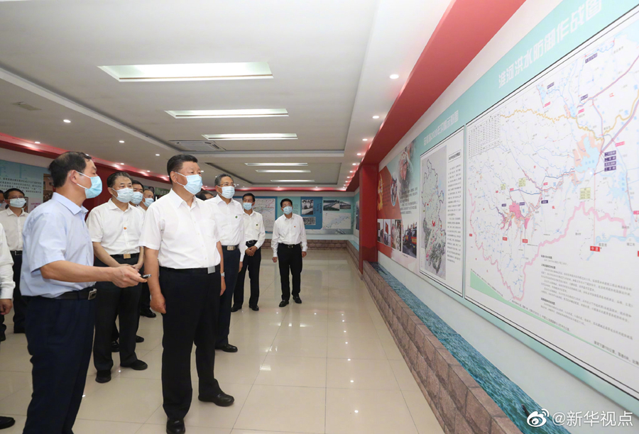 習近平總書記18日赴安徽考察調研。當天下午,他先后來到阜陽市阜南縣王家壩閘、紅亮箱包有限公司、蒙洼蓄洪區曹集鎮利民村西田坡莊臺,察看淮河水情,走進田間地頭,了解當地防汛救災和災后恢復生產等情況,看望慰問受災群眾。(文字記者:張曉松 攝影記者:鞠鵬 王曄)
