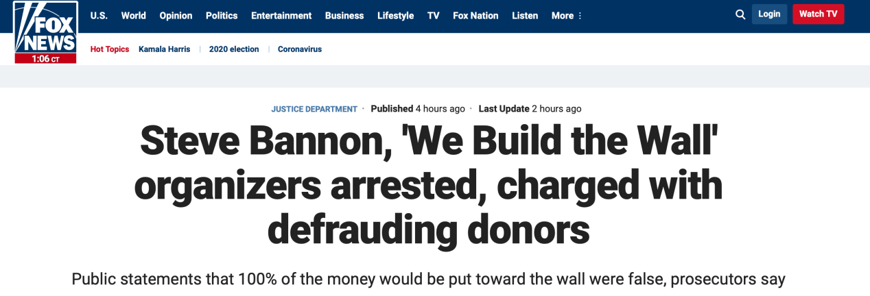 紐約曼哈頓地檢署的這份訴狀中稱,班農和科爾法奇曾對大眾表示,該組織是一個“志愿性組織”,籌得的款項將全部用于筑墻。此外,二人還屢次宣稱他們將不會“拿走籌得款項中的一分錢”。據NBC新聞報道,科爾法奇曾數次公開表示:“我不可能拿走里面的錢,它們不屬于我。”
