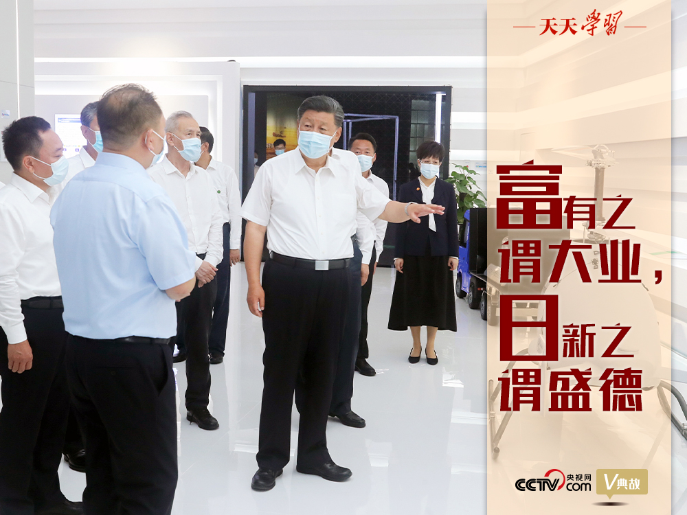 上述講話中引用的“富有之謂大業,日新之謂盛德”出自《周易·系辭上傳》,意思是:廣泛創造物質財富和精神財富叫做弘大功業,持續永遠的日日增新叫做盛美德行。