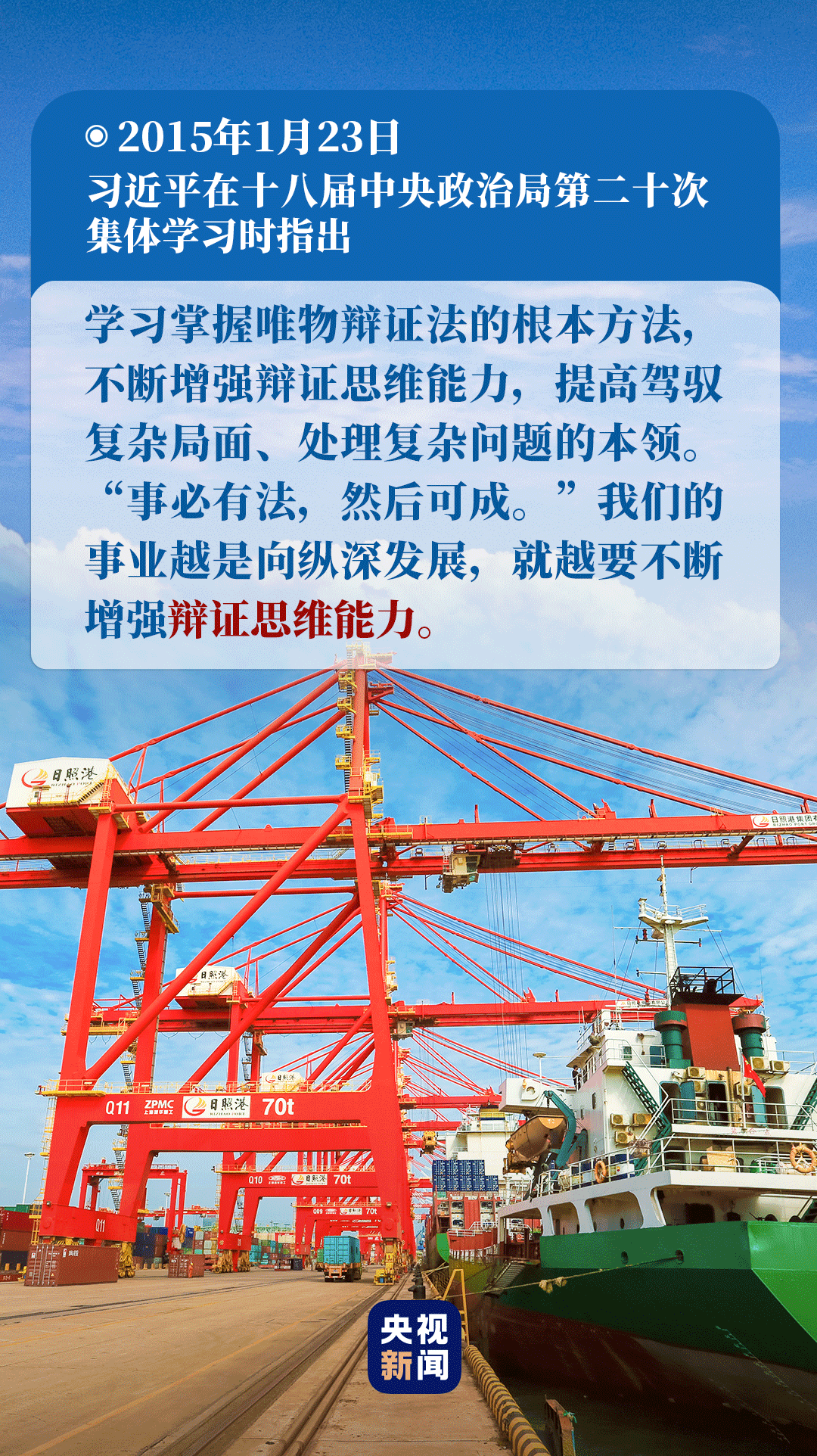 “要堅持發展地而不是靜止地、全面地而不是片面地、系統地而不是零散地、普遍聯系地而不是單一孤立地觀察事物,妥善處理各種重大關系。”2015年1月23日,習近平在十八屆中央政治局第二十次集體學習時的講話中,對如何在實際工作中運用唯物辯證法,作出了深刻闡述。