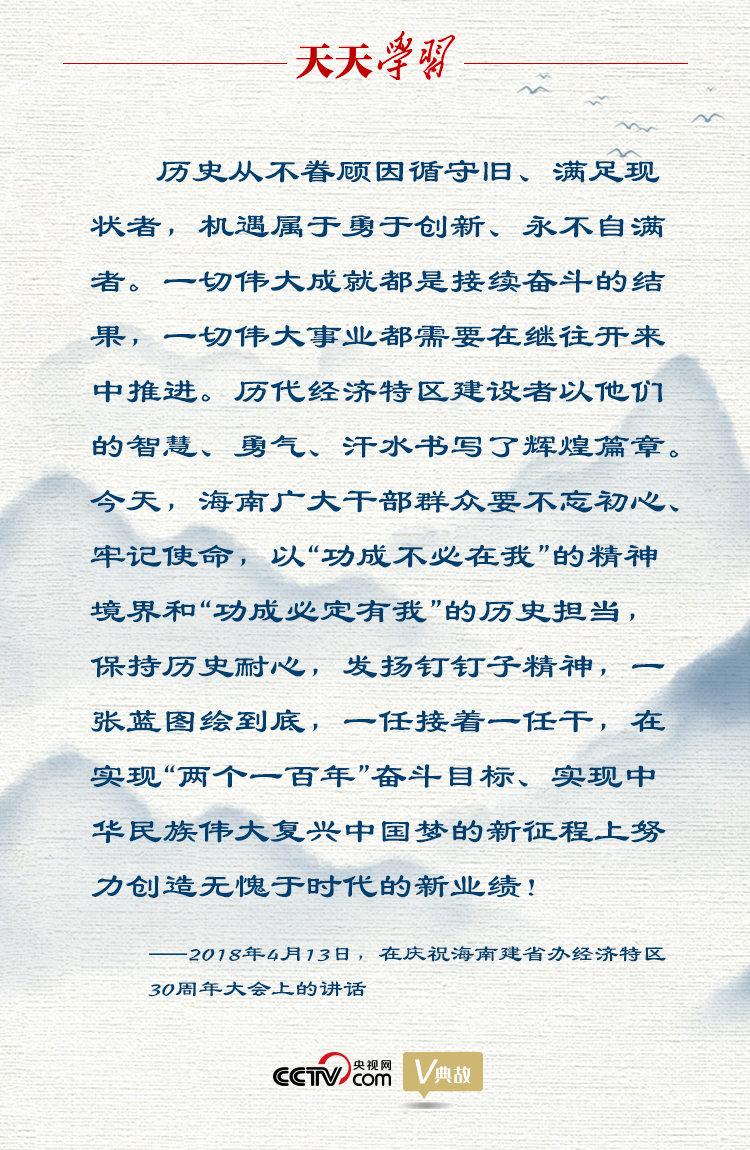 2018年4月13日,在慶祝海南建省辦經(jīng)濟特區(qū)30周年大會上,習(xí)近平總書記充分肯定經(jīng)濟特區(qū)建設(shè)的歷史功績,深刻總結(jié)經(jīng)濟特區(qū)建設(shè)的寶貴經(jīng)驗,提出在新時代新起點上繼續(xù)把全面深化改革推向前進,強調(diào)要以“功成不必在我”的精神境界和“功成必定有我”的歷史擔(dān)當(dāng),保持歷史耐心,發(fā)揚釘釘子精神,一張藍圖繪到底,一任接著一任干,為新時代進一步辦好經(jīng)濟特區(qū)指明了前進方向、提供了根本遵循。