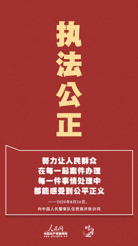 執法公正——“公平正義是政法工作的生命線。”公安執法工作量大面廣,與老百姓生活密切相關。新時代,執法公正上升到新的高度,凝聚著習近平總書記對廣大公安民警的殷切期望。習近平強調,要抓住關鍵環節,完善執法權力運行機制和管理監督制約體系,努力讓人民群眾在每一起案件辦理、每一件事情處理中都能感受到公平正義。