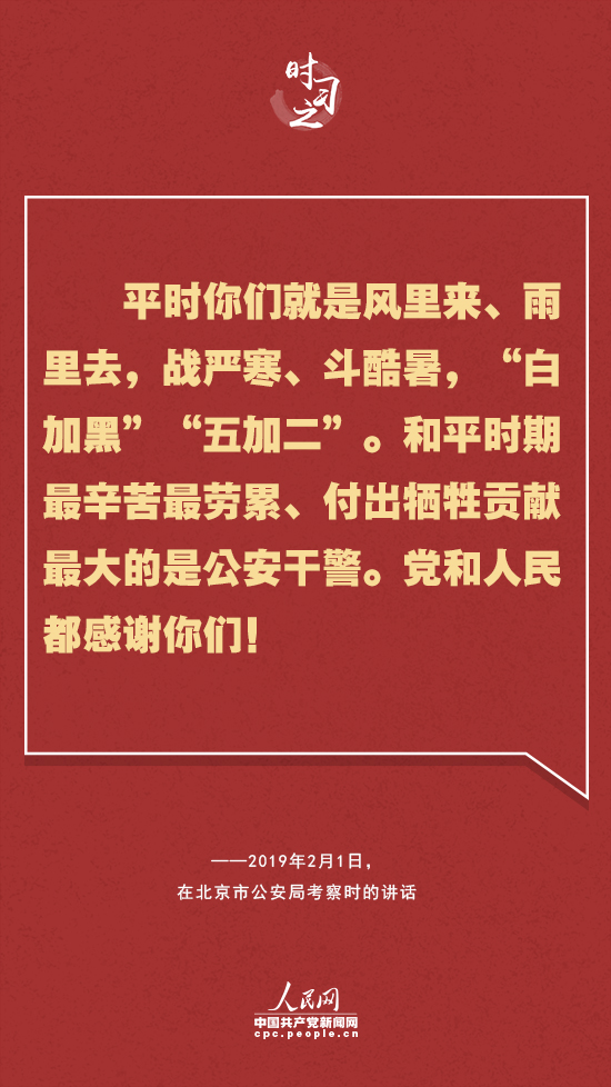 對人民警察這支和平時期“犧牲最多、奉獻最大”的特殊隊伍,習近平多次表達感謝——“你們用實際行動兌現了‘人民公安為人民’的莊嚴承諾,弘揚了正氣,發揮了榜樣作用,不愧為黨的群眾路線的忠實踐行者,不愧為人民群眾的貼心人,黨和人民感謝你們。”“正是有了你們的辛勤付出和流血犧牲,才換來了廣大人民群眾的安寧和幸福。你們不愧為黨和人民的忠誠衛士,黨和人民感謝你們。”“平時你們就是風里來、雨里去,戰嚴寒、斗酷暑,‘白加黑’‘五加二’。和平時期最辛苦最勞累、付出犧牲貢獻最大的是公安干警。黨和人民都感謝你們!”