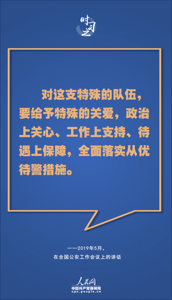 同時,習近平指出,對這支特殊的隊伍,要給予特殊的關愛,政治上關心、工作上支持、待遇上保障,全面落實從優待警措施。要完善人民警察榮譽制度,加大先進典型培育和宣傳力度,增強公安民警的職業榮譽感、自豪感、歸屬感。