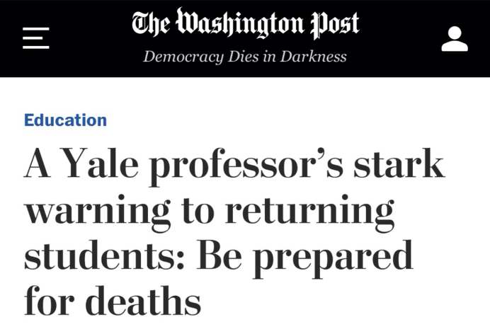 當耶魯大學宣布打算在秋季學期重啟線下教學時,該校心理學教授勞里·桑托斯對學生們發出預警:返校可能會帶來“生死攸關的后果”。