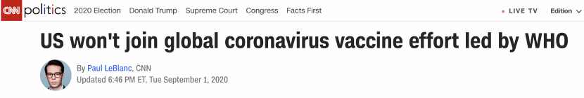 對此,CNN評論稱,特朗普政府在美國確診病例超過600萬的關鍵時刻作出這一決定,將使美國孤立于參與“新冠肺炎疫苗實施計劃(COVAX)”的170多個國家之外。