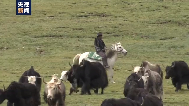 青海玉樹州稱多縣十一村牧民 西尕:這一共有200多頭牛,一大半不是我家的。合作社放牧施行輪流制,今天輪到我。一般來說每五天放一天就可以,然后是像我的話是每五天放兩天,其他時候可以在家干活,編制投石器、鞣皮革或者縫制衣服去賣。