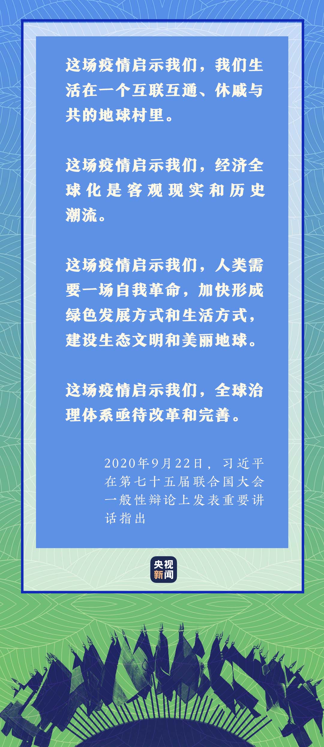 “各國人民守望相助,展現(xiàn)出人類在重大災(zāi)難面前的勇氣、決心、關(guān)愛,照亮了至暗時刻。”習(xí)近平主席在第七十五屆聯(lián)合國大會一般性辯論上,深刻總結(jié)疫情帶來的重要啟示,進(jìn)一步回答了“世界怎么了、我們怎么辦”的時代之問。