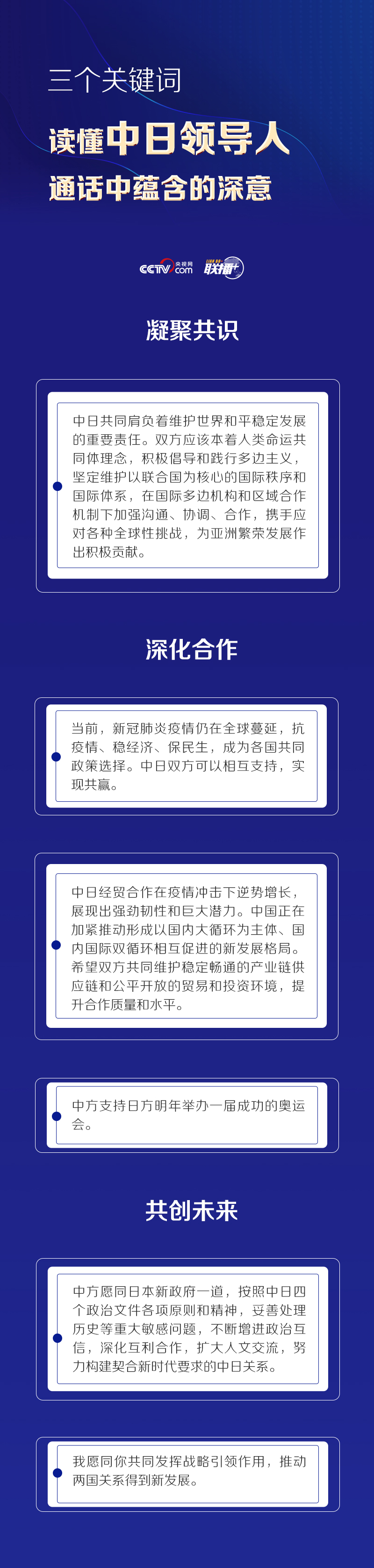 9月25日晚,習近平主席同日本首相菅義偉通電話。通話中,兩國領導人就中日關系、深化各領域合作等話題進行交流。具體通話內容,央視網《聯播+》為您梳理。
