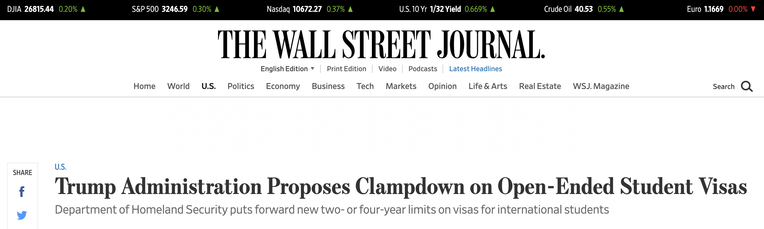 《華爾街日報(bào)》報(bào)道稱,今年,由于美國政府的移民政策和因新冠疫情而采取的旅行限制,許多學(xué)校的留學(xué)生入學(xué)人數(shù)都出現(xiàn)了下降。