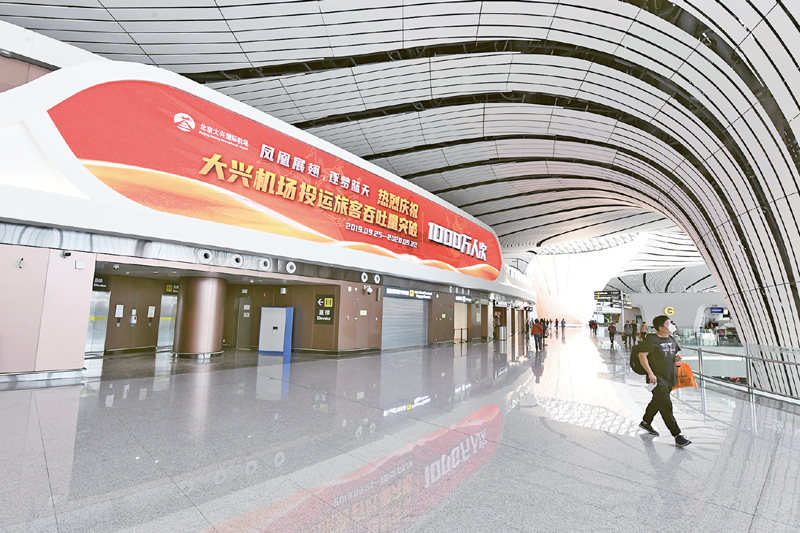 2019年9月25日,北京大興國際機場投運儀式在北京舉行,習近平總書記出席儀式,宣布機場正式投運并巡覽航站樓。時隔一年,2020年9月22日,北京大興國際機場迎來第1000萬名旅客。圖為22日當天拍攝的機場內景。 新華社記者 任超/攝