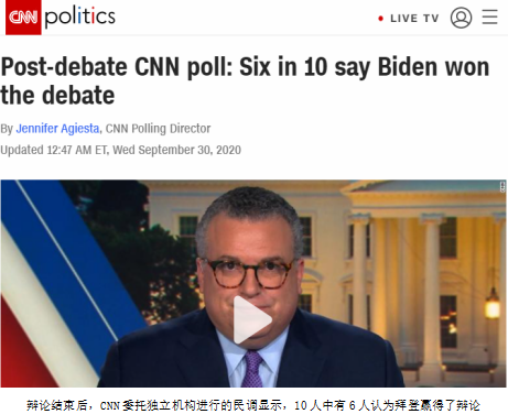 在這場被稱為有史以來最混亂的辯論結(jié)束后,CNN委托獨立機(jī)構(gòu)SSRS進(jìn)行的辯論民調(diào)顯示,每10名觀眾中,就有6人認(rèn)為拜登表現(xiàn)較好,只有28%的受訪者認(rèn)為特朗普表現(xiàn)較好。與此同時,65%的受訪者認(rèn)為拜登的回答比特朗普更真誠,只有29%的受訪者認(rèn)為特朗普講了真話。另外,整體而言,69%的受訪者認(rèn)為拜登對特朗普的攻擊比較公平,只有32%的受訪者認(rèn)為特朗普的攻擊是公平的。(央視記者 顧?quán)l(xiāng))
