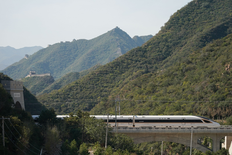 一列復興號高鐵列車從京張高鐵駛過居庸關長城(10月6日攝)。新華社記者 鞠煥宗 攝