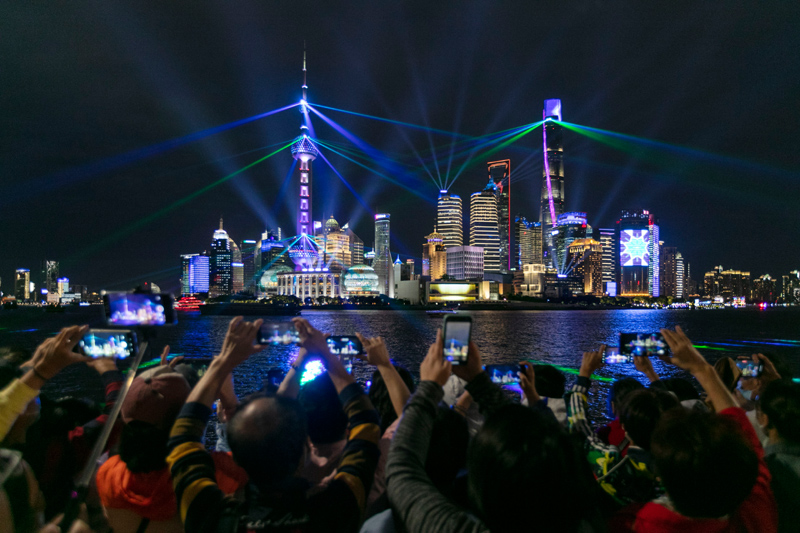 人們在上海外灘觀賞燈光秀(10月5日攝)。新華社記者 王翔 攝