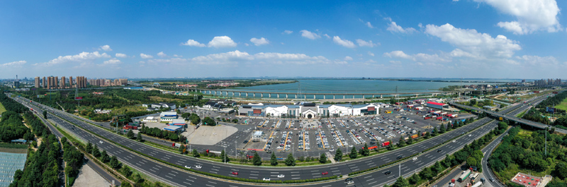 這是滬寧高速公路蘇州段陽澄湖服務區(10月8日攝,無人機全景拼接照片)。陽澄湖服務區于2019年5月完成升級改造,通過大型水景等元素還原“詩畫江南”意境,成為當地的“新景點”。新華社記者 李博 攝
