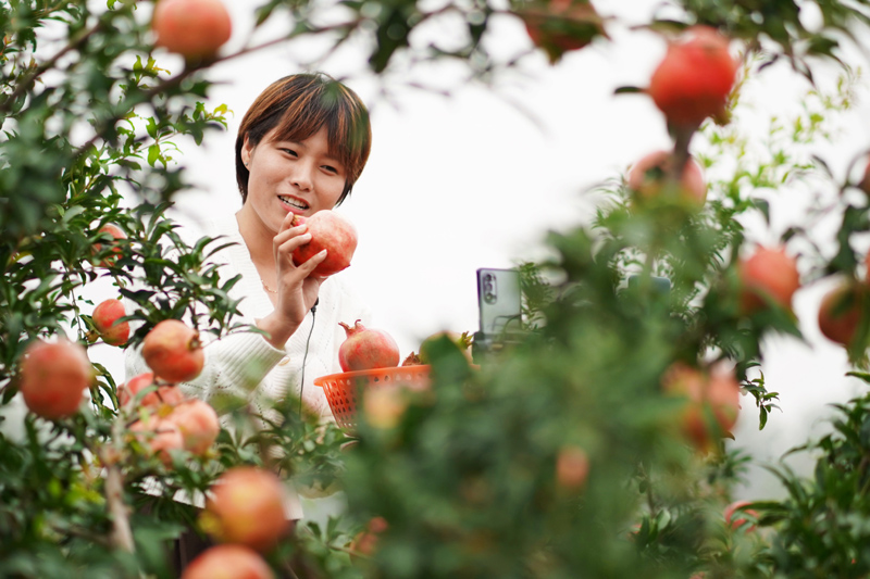河北省邢臺市內丘縣五郭店鄉東磁窯溝村農民在石榴園通過網絡直播銷售石榴(10月2日攝)。新華社記者 朱旭東 攝